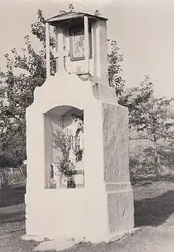 - cztery stare kamienne krzyże ustawione przed murem cmentarza kościelnego oraz kapliczka słupowa wmurowana w mur. Krzyże i kapliczka określane są często jako tzw. pokutne co jednak nie ma podstaw w żadnych dowodach ani badaniach, a jest oparte jedynie na nieuprawnionym założeniu, że wszystkie stare kamienne krzyże monolitowe, o których nic nie wiadomo, są krzyżami pokutnymi[12], chociaż w rzeczywistości powód fundacji takich krzyży może być różnoraki, tak jak każdego innego krzyża. Niestety hipoteza ta stała się na tyle popularna, że zaczęła być odbierana jako fakt i pojawiać się w lokalnych opracowaniach, informatorach czy przewodnikach jako faktyczna informacja, bez uprzedzenia, że jest to co najwyżej luźny domysł bez żadnych bezpośrednich dowodów.