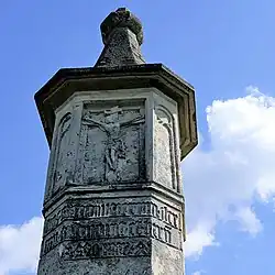 Słup w formie czworobocznego graniastosłupa ze ściętymi narożnikami wykonano z wapienia pińczowskiego. Nakrywa go kamienny daszek z kulą na szczycie. W górnej jego części, w niszach na szerszych ścianach widnieją płaskorzeźby. Na przedniej ścianie wyrzeźbiono wizerunek Chrystusa na krzyżu[3]. Pod krucyfiksem na trzech sąsiednich ścianach wygrawerowano minuskułą gotycką tekst w języku łacińskim: