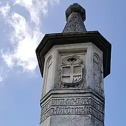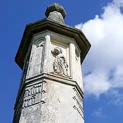 U dołu znajduje się napis w języku polskim. Wynika z niego, że w czerwcu 1898 roku słup odnowiono z funduszu Crona oraz kosztem jego konserwatorów i państwa Małgorzaty i Józefa Schinzlów[5]. Na bocznych ścianach wyrzeźbiono wizerunki Matki Bożej i św. Jana Ewangelisty, natomiast na tylnej ścianie herb jego fundatora – Dębno pod kapeluszem kardynalskim. Pod herbem, również na trzech sąsiednich ścianach, wykuto napis:
