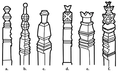 Przykłady męskich (a-c) i żeńskich (d-f) słupów szeklerskich.