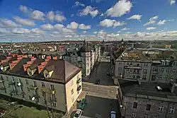 W dwudziestoleciu międzywojennym oś miasta wyznaczały obecne ulice Tuwima, Nowobramska, Kowalska i Armii Krajowej, w pobliżu których znajdowały się najważniejsze budowle. Charakterystycznym obiektem była neogotycka synagoga, spalona w 1938 roku.