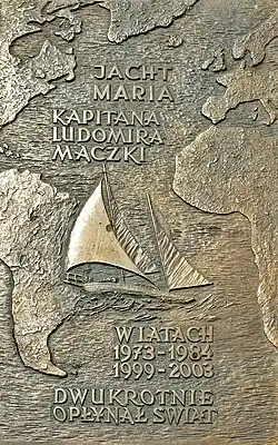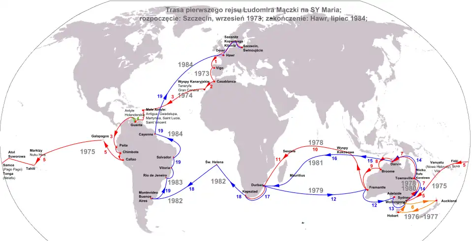 - ↑ Cytaty ze wspomnień Ludomira Mączki, które zostały zamieszczone w niniejszym artykule, pochodzą z książki „Z Marią przez życie i oceany. Opowieści kapitana Ludomira Mączki”. Została napisana przez Jana W. Zamorskiego, polonijnego żeglarza i popularyzatora żeglarstwa, przede wszystkim na podstawie gawęd Ludka, nagranych za jego zgodą (autor starał się nadać książce charakter autobiografii). Najwięcej nagrań pochodzi z roku 2003, gdy Ludek przebywał przez trzy tygodnie w domu autora w Mississauga (Ontario), na rekonwalescencji po kolejnej ciężkiej operacji. Ludek opowiadał o „Marii” i swoim życiu w czasie spotkań z zaproszonymi żeglarzami. Snuł wspomnienia barwnie i z humorem, ale bez chronologicznego porządku. W porządkowaniu nagranego materiału pomagał kpt. Wojciech Jacobson (najbliższy przyjaciel bohatera książki i współtowarzysz wielu jego rejsów). Zadbano o zachowanie tonacji, słownictwa i frazeologii gawędy. Poza tekstem, napisanym w pierwszej osobie, w opracowaniu zamieszczono liczne zdjęcia, mapy, kopie dokumentów, artykułów prasowych oraz prywatnych listów do i od Ludka.