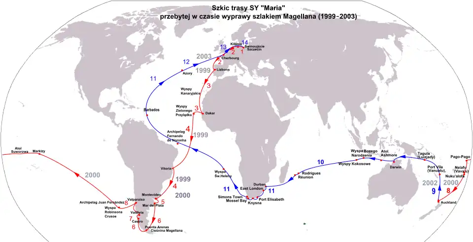 - ↑ „Victoria” jacht wybudowany na wzór karaki Magellana, długość 24 m, której budowę rozpoczęto kilkanaście lat wcześniej w Kołobrzegu. Od roku 1993 budowę kontynuował kpt. Rudolf Krautschneider („Ruda”), z kolegami.