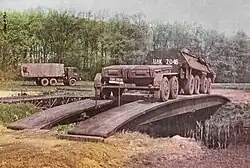 Do poruszania się po lądzie transportery wyposażono w układ 8×8, to jest z przeniesieniem napędu na wszystkie koła[10]. Zawieszenie kół niezależne[10]. Do tłumienia drgań zastosowano 10 teleskopowych amortyzatorów hydraulicznych, po 2 w zawieszeniu pierwszej pary kół i po 1 w pozostałych[10]. Ogumienie o wymiarach 13,00 – 18" z regulowanym ciśnieniem powietrza w każdym kole. Układ kierowniczy wspomagany hydraulicznie[10]. Główny układ hamulcowy typu bębnowego, dwuobwodowy (jeden obwód na 1 i 3 parę kół, drugi na 2 i 4 parę kół) z pneumatyczno-hydraulicznym- układem uruchamiającym. Pomocniczy układ hamulcowy typu bębnowego zamontowany na wale napędowym między skrzynią rozdzielczą a tylną przekładnią międzymostową.