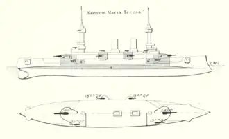 „Kaiserin und Königin Maria Theresia” miał architekturę zbliżoną do pancerników końca lat 80. XIX wieku. Kadłub był gładkopokładowy, z taranową dziobnicą[8]. Uzbrojenie główne – dwa działa 240 mm, umieszczone były w barbetach nakrytych wypukłymi osłonami, na pokładzie dziobowym i rufowym. Po raz pierwszy w austro-węgierskiej marynarce działa były poruszane elektrycznie, a nie hydraulicznie, co pozwoliło zaoszczędzić na masie[6]. Pomiędzy barbetami na całym śródokręciu była długa nadbudówka, na szerokość kadłuba. W jej ścianach były umieszczone kazamaty dla czterech dział 150 mm (po dwa na burtę). Kazamaty pozostałych czterech dział były w burtach, poniżej pokładu górnego, za barbetami (dzięki wycięciu burt w rejonie barbet, mogły one strzelać na wprost w kierunku dziobu lub rufy)[8]. Na centralnej nadbudówce znajdowała się z przodu nadbudówka dziobowa, dalej dwa proste, niewysokie kominy i na końcu nadbudówka rufowa. Po bokach kominów były składowane łodzie. Lekkie działka 47 mm znajdowały się na stanowiskach na pokładach nadbudówek oraz w kazamatach. Sylwetkę okrętu wyróżniały dwa grube, rurowe maszty bojowe, na nadbudówce dziobowej i rufowej, wyposażone w platformy z działkami[8]. Około 1903 niepraktyczne maszty bojowe zostały zamienione na zwykłe maszty palowe[9].