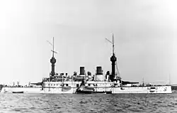![]() Wygląd po wejściu do służby, z masztami bojowymi i w „wiktoriańskim” malowaniu. | |