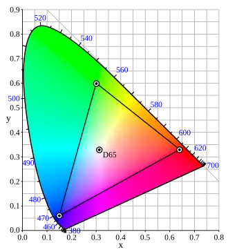 W sRGB zdefiniowana jest Chromatyczność barw podstawowych; czerwonej, zielonej i niebieskiej, w których w trzech składowych sRGB jedna z wartości jest różna od zera, a dwie pozostałe są równe zero. Zakres chromatyczności, która może być reprezentowana w sRGB, jest trójkątem koloru zdefiniowanym przez chromatyczność kolorów podstawowych. Podobnie jak w przypadku każdej przestrzeni kolorów RGB, dla nieujemnych wartości R, G i B nie jest możliwe przedstawienie kolorów poza tym trójkątem, który znajduje się w zakresie kolorów widocznych dla człowieka z normalnym trójchromatycznym widzeniem.