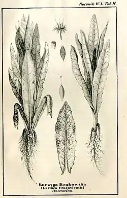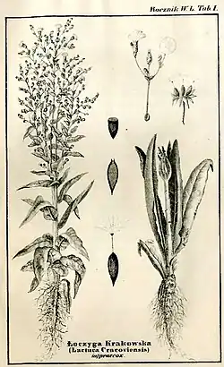 Gatunek czwarty: Łoczyga krakowska (L[actuca] cracoviensis). Gatunek ten sałaty warzywnej od czasów niepamiętnych w dwóch wsiach naszemu miastu przyległych, Czarnej i Nowej, zasiewany, pod nazwiskiem głąbików powszechnie jest znajomym. Głąbiki, tak zwane, krakowskie, jako tylko miastu naszemu właściwe, łącznie z innemi roślinami warzywnemi, włoszczyzną pospolicie nazywanemi, na rynku sprzedawane, są zdrową i powszechnie lubioną jarzyną[25].