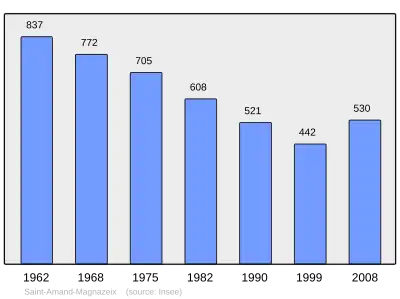 Według danych na rok 1990 gminę zamieszkiwało 521 osób, a gęstość zaludnienia wynosiła 17 osób/km² (wśród 747 gmin Limousin Saint-Amand-Magnazeix plasuje się na 247. miejscu pod względem liczby ludności, natomiast pod względem powierzchni na miejscu 161.).