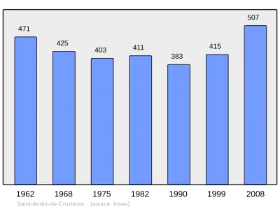Według danych na rok 1990 gminę zamieszkiwały 383 osoby, a gęstość zaludnienia wynosiła 19 osób/km² (wśród 2880 gmin regionu Rodan-Alpy Saint-André-de-Cruzières plasuje się na 1249. miejscu pod względem liczby ludności, natomiast pod względem powierzchni na miejscu 497.).