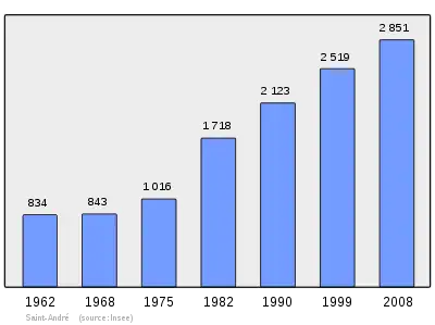 Według danych na rok 1990 gminę zamieszkiwały 2123 osoby, a gęstość zaludnienia wynosiła 218 osób/km² (wśród 1545 gmin Langwedocji-Roussillon Saint-André plasuje się na 182. miejscu pod względem liczby ludności, natomiast pod względem powierzchni na miejscu 768.).