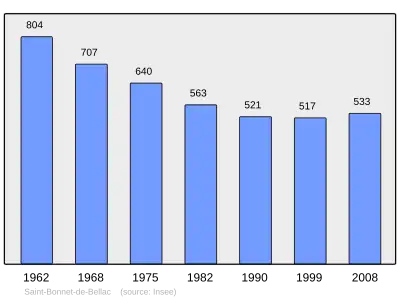 Według danych na rok 1990 gminę zamieszkiwało 521 osób, a gęstość zaludnienia wynosiła 15 osób/km² (wśród 747 gmin Limousin Saint-Bonnet-de-Bellac plasuje się na 247. miejscu pod względem liczby ludności, natomiast pod względem powierzchni na miejscu 123.).