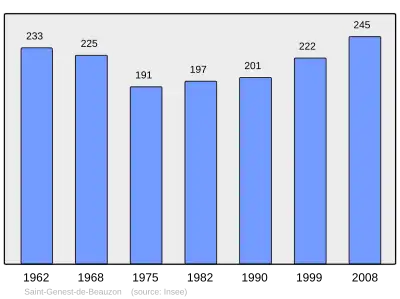 Według danych na rok 1990 gminę zamieszkiwało 201 osób, a gęstość zaludnienia wynosiła 38 osób/km² (wśród 2880 gmin regionu Rodan-Alpy Saint-Genest-de-Beauzon plasuje się na 1426. miejscu pod względem liczby ludności, natomiast pod względem powierzchni na miejscu 1493.).