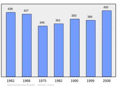Według danych na rok 1990 gminę zamieszkiwały 393 osoby, a gęstość zaludnienia wynosiła 20 osób/km² (wśród 747 gmin Limousin Saint-Genest-sur-Roselle plasuje się na 302. miejscu pod względem liczby ludności, natomiast pod względem powierzchni na miejscu 349.).