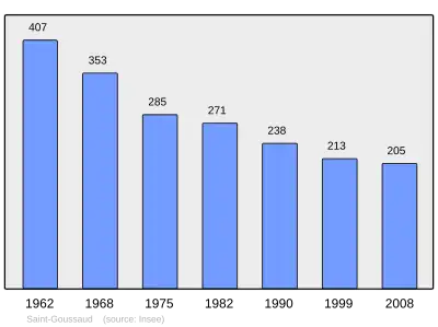 Według danych na rok 1990 gminę zamieszkiwało 238 osób, a gęstość zaludnienia wynosiła 10 osób/km² (wśród 747 gmin Limousin Saint-Goussaud plasuje się na 401. miejscu pod względem liczby ludności, natomiast pod względem powierzchni na miejscu 269.).