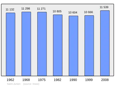 Według danych na rok 1990 gminę zamieszkiwały 10 604 osoby, a gęstość zaludnienia wynosiła 187 osób/km² (wśród 747 gmin Limousin Saint-Junien plasuje się na 6. miejscu pod względem liczby ludności, natomiast pod względem powierzchni na miejscu 19.).