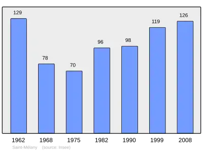 Według danych na rok 1990 gminę zamieszkiwało 98 osób, a gęstość zaludnienia wynosiła 9 osób/km² (wśród 2880 gmin regionu Rodan-Alpy Saint-Mélany plasuje się na 1523. miejscu pod względem liczby ludności, natomiast pod względem powierzchni na miejscu 1054.).