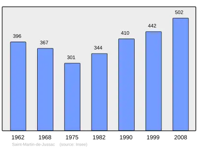 Według danych na rok 1990 gminę zamieszkiwało 410 osób, a gęstość zaludnienia wynosiła 28 osób/km² (wśród 747 gmin Limousin Saint-Martin-de-Jussac plasuje się na 293. miejscu pod względem liczby ludności, natomiast pod względem powierzchni na miejscu 453.).