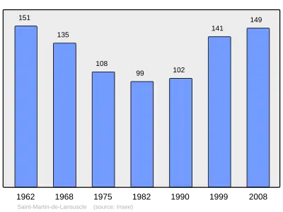 Według danych na rok 1990 gminę zamieszkiwały 102 osoby, a gęstość zaludnienia wynosiła 6 osób/km² (wśród 1545 gmin Langwedocji-Roussillon Saint-Martin-de-Lansuscle plasuje się na 800. miejscu pod względem liczby ludności, natomiast pod względem powierzchni na miejscu 468.).