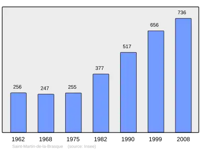 Według danych na rok 1990 gminę zamieszkiwało 517 osób, a gęstość zaludnienia wynosiła 92 osoby/km² (wśród 963 gmin regionu Prowansja-Alpy-W. Lazurowe Saint-Martin-de-la-Brasque plasuje się na 480. miejscu pod względem liczby ludności, natomiast pod względem powierzchni na miejscu 790.).