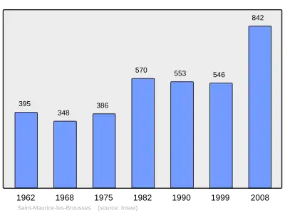 Według danych na rok 1990 gminę zamieszkiwały 553 osoby, a gęstość zaludnienia wynosiła 51 osób/km² (wśród 747 gmin Limousin Saint-Maurice-les-Brousses plasuje się na 235. miejscu pod względem liczby ludności, natomiast pod względem powierzchni na miejscu 540.).