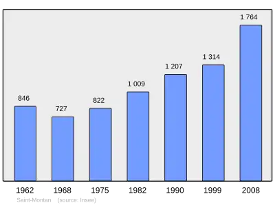 Według danych na rok 1990 gminę zamieszkiwało 1207 osób, a gęstość zaludnienia wynosiła 36 osób/km² (wśród 2880 gmin regionu Rodan-Alpy Saint-Montan plasuje się na 681. miejscu pod względem liczby ludności, natomiast pod względem powierzchni na miejscu 168.).