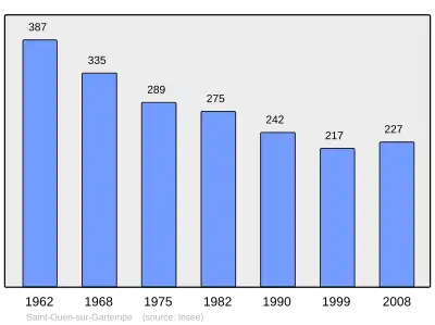 Według danych na rok 1990 gminę zamieszkiwały 242 osoby, a gęstość zaludnienia wynosiła 11 osób/km² (wśród 747 gmin Limousin Saint-Ouen-sur-Gartempe plasuje się na 398. miejscu pod względem liczby ludności, natomiast pod względem powierzchni na miejscu 299.).