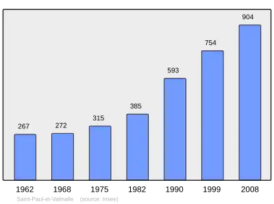 Według danych na rok 1990 gminę zamieszkiwały 593 osoby, a gęstość zaludnienia wynosiła 47 osób/km² (wśród 1545 gmin Langwedocji-Roussillon Saint-Paul-et-Valmalle plasuje się na 475. miejscu pod względem liczby ludności, natomiast pod względem powierzchni na miejscu 624.).