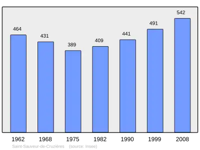 Według danych na rok 1990 gminę zamieszkiwało 441 osób, a gęstość zaludnienia wynosiła 18 osób/km² (wśród 2880 gmin regionu Rodan-Alpy Saint-Sauveur-de-Cruzières plasuje się na 1197. miejscu pod względem liczby ludności, natomiast pod względem powierzchni na miejscu 343.).