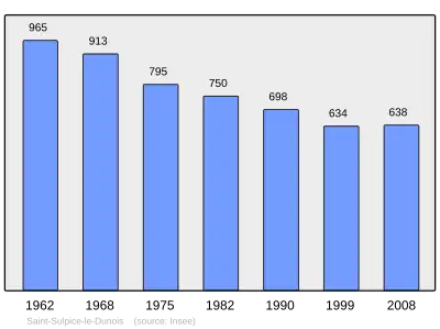 Według danych na rok 1990 gminę zamieszkiwało 698 osób, a gęstość zaludnienia wynosiła 23 osoby/km² (wśród 747 gmin Limousin Saint-Sulpice-le-Dunois plasuje się na 190. miejscu pod względem liczby ludności, natomiast pod względem powierzchni na miejscu 167.).