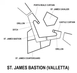 - 1 2 St James Cavalier – Valletta. National Inventory of the Cultural Property of the Maltese Islands, 2013-06-28. [zarchiwizowane z tego adresu (2015-07-13)]. (ang.).