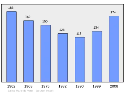 Według danych na rok 1990 gminę zamieszkiwało 118 osób, a gęstość zaludnienia wynosiła 21 osób/km² (wśród 747 gmin Limousin Sainte-Marie-de-Vaux plasuje się na 496. miejscu pod względem liczby ludności, natomiast pod względem powierzchni na miejscu 640.).