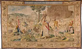 W Sali pod Zodiakiem znajdują się następujące arrasy wawelskie z serii "Dzieje Wieży Babel"