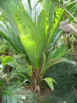 - Palmy kępiaste, o skróconych, niemal w całości podziemnych pędach, przesłoniętych dodatkowo trwałymi nasadami liści[5][9].