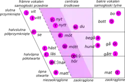 Niektóre języki, np. szwedzki czy norweski, mają bogato rozwinięty system samogłosek wtórnych. Oto diagram Jonesa dla samogłosek w języku szwedzkim[19][20]: