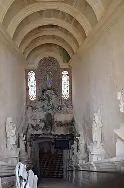 Od drzwi wejściowych, w dół do groty prowadzą schody. Ponad nimi sklepienie kolebkowe wsparte na łukach. Na tylnej ścianie na wysokości wejścia, nad łukiem okalającym wejście do właściwej groty, znajduje się figura Matki Bożej z Lourdes[4].