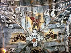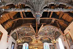 Unikatowe drewniane pseudosklepienie, tworzące iluzję podziału na dwie nawy, po pięć przęseł każda, wykonał w 1697 r. Michał Pahl, samorodny talent, z zawodu pomocnik młynarski. Z powodu braku podpór, żebra sklepienia wspierają się na wiszących wspornikach ozdobionych liśćmi akantu i szyszkami. W kolorowych łukach unoszą się na niebieskim tle postacie aniołów z instrumentami muzycznymi i gałązkami palm. Pomiędzy nimi liczne wstęgi z biblijnymi wersetami, m.in. „Gloria in excelsis Deo”. Także malowidła przypisuje się owemu młynarczykowi, Michałowi Pahlowi. Jako protestant, w harmonijny sposób pogodził on na stropie dwa tematy, będące obecnie istotą każdego sanktuarium maryjnego. Temat maryjny umieścił nad ołtarzem wokół figury Madonny, natomiast temat chrystologiczny w centrum kościoła. Otóż połączenie tych dwóch tematów, jest charakterystyczne dla obrządku rzymskokatolickiego. Właśnie to wielkie zadanie, jako drogę każdego katolika, streszcza, na wyremontowanym fragmencie nad chórem, jeden z aniołów z szarfą: „Przez Maryję do Jezusa”. Jest to jedyny napis w języku polskim na malowidle stropu. Na ścianie godło z autoportretem i inskrypcją: „Michał Pahl, uczeń młynarski ozdobił ten kościół robotą ciesielską, stolarską i rzeźbiarską w roku 1697”.