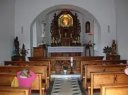 We wnętrzu znajduje się barokowy ołtarz z obrazem Matki Bożej, figurami Apostołów Piotra i Pawła oraz figurą św. Michała Archanioła. Obraz Matki Bożej Trzykroć Przedziwnej, Zwycięskiej Królowej z Szensztatu jest kopią dzieła stworzonego w końcu XIX wieku przez włoskiego malarza Luigi Crosio (1835 - 1915). Obraz odzwierciedla głęboką więź Chrystusa i Maryi.