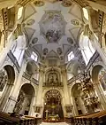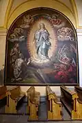 Prezbiterium jest oddzielone od nawy kratą. Ołtarz główny jest dziełem Karla Sebastiana Flackera. W centrum znajduje się rzeźba Madonny z Dzieciątkiem adorowana przez dwa anioły. Figurka wykonana z drewna lipowego ma 28 cm. Pochodzi z końca XIV w.