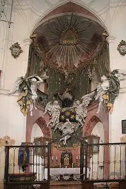 Z zewnątrz budowla przedstawia cechy typowo gotyckie. Ostrołukowe okna i drzwi, przywodzące na myśl ręce złożone do modlitwy, czy niewielka ilość ozdób, nie wyrażają w pełni uroku wnętrza świątyni. Jej centralna część otwiera się na 5 niszy, w których znajdują się ołtarze, z pełnymi ekspresji barokowymi figurami. Szczególnie interesująco wyglądają 4 ołtarze boczne przedstawiające ewangelistów wraz z ich symbolami. Postacie otoczone są językami ognia, które dodatkowo dynamizują przedstawiane sceny. Ołtarz główny znajduje się w nawie wschodniej.
