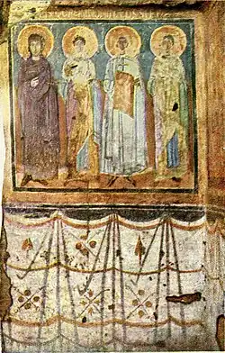 Bliskie temu hieratycznemu stylowi jest wykonanie fryzu świętych skupionych wokół Chrystusa na majestacie (z nawy północnej). Kontrastują z tym freski pochodzące z drugiej ćwierci lub z połowy VII w., np. Zwiastowanie, Matka Machabeuszy, Święci Demetriusz i Barbara, utrzymane w stylu wyraźnie czerpiącym z tradycji hellenistycznej. Jego wyraziste cechy: umieszczone w otwartej przestrzeni ciała – plastycznie oddane swobodnym modelunkiem światłocieniowym i kolorystyką o znacznej skali odcieni, jak również owalne twarze o regularnych rysach, pozbawione przesadnie uduchowionego wyrazu, pozwalają je przypisywać artystom z ośrodków bliskowschodnich (Antiochia, Aleksandria)[12].