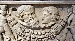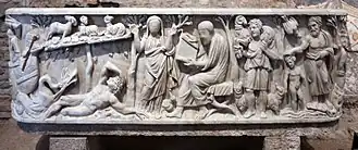 Dla rzeźby wczesnochrześcijańskiej szczególnie istotne znaczenie ma trzeci sarkofag, także odkryty pod posadzką kościoła, a powstały ok. 240 roku. Główne przedstawienie na licowej ścianie obejmuje postacie orantki i czytającego filozofa ze zwojem pism, a także Dobrego Pasterza z dwiema owcami i trzecią unoszoną na ramionach. Sceny poboczne to: (z lewej) spoczywający pod rośliną (symbolizującą dynię) prorok Jonasz z kozami, wijący się potwór morski i postać Neptuna, oraz (z prawej) scena chrztu i dwaj rybacy z siecią. Głowy głównych postaci nie zostały wykończone i nie otrzymały rysów konkretnych osób. Obydwie postacie mają uosabiać zasadnicze ideały życia – mądrość i pobożność, co jako typ prywatnej idealizacji różni to przedstawienie od wcześniejszego, pogańskiego typu apoteozy prywatnej, gdy rysy zmarłych utrwalano w wyobrażeniach olimpijskich bogów[18].