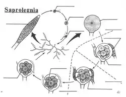 W fazie bezpłciowej Saprolegnia parasitica uwalnia pływki (zoospory). W ciągu kilku minut pływka otorbia się, kiełkuje i uwalnia kolejną pływkę z dwoma różniącymi się wiciami. Druga pływka żyje dłużej; porusza się w wodzie szukając pokarmu, a jeśli go nie znajdzie znów otorbia się i uwalnia nową pływkę. Proces ten zwany poliplanetyzmem może powtarzać się 6-krotnie. Kiedy pływka znajdzie odpowiednie podłoże, za pomocą otaczających ją włosków przyczepia się do niego i może rozpocząć fazę rozmnażania płciowego. Po skolonizowaniu podłoża wytwarza męskie i żeńskie gametangium: (plemnię (anterydium) i lęgnię (oogonium). Te łączą się ze sobą za pomocą włostka. W wyniku zapłodnienia powstaje zygota, a z niej oospora[4].