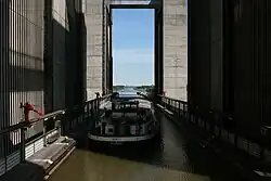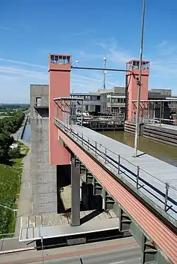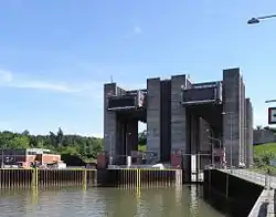 Różnica poziomów pomiędzy górnym a dolnym odcinkiem kanału wynosi 38 metrów. Różnicę tę statki pokonują w wypełnionej wodą olbrzymiej wannie, która jest podnoszona oraz opuszczana w pionie.