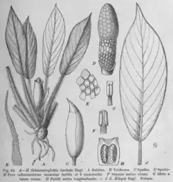 - Grupa S. corneri – łodyga plejonantyczna, górna część pochwy pozostająca po przekwitnięciu rośliny, a następnie rozkładająca się i opadająca na dolną część, pochwa liściowa języczkowata, ze stałymi skrzydełkami, ogonek liściowy otoczony pochwą co najmniej w 1/3 długości, liście bez cataphylle, szypułka z kwiatostanem zwisająca, odcinki kwiatów męskich i żeńskich przylegające na kolbie