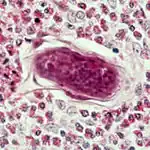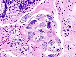 | Obraz histopatologiczny ściany pęcherza zawierającej jaja S. haematobium otoczone tkanką zapalną i naciekiem eozynofilów. | ![]() |