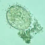 | Schistosoma mekongi | 69 × 56 µm (51–73 × 39–66 µm). | Okrągłe, mały kolec na tylnym biegunie może być słabo widoczny. Żółte lub żółtobrązowe, w środku zawierają dojrzałe miracidium. | Kał | ![]() |