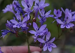 - Zebrane w luźne, zaokrąglone do spłaszczonych, fałszywe wiechy. W dolnej części łodygi kwiatostany złożone są z większej liczby kwiatów, w górnej na pędach bocznych wyrasta od 1 do 2, rzadziej do 4 kwiatów. Podkwiatki zielone, często z czerwonymi brzegami, o długości 4–7 mm. Kwiaty grzbieciste, długowieczne, często talerzykowate, wydzielające delikatny, słodki zapach. Listki okwiatu w dolnej części zrośnięte w cylindryczną rurkę, o długości 7–14 mm i średnicy od 1 mm u nasady do 2 mm u ujścia gardzieli, powyżej wolne, eliptyczne, tępe, nierównej długości. Górna warga o wymiarach 10–13 × ±4,5 mm, dolna 10–12 × ±4 mm. Okwiat albo biały i wówczas dolne listki pokryte są jednym lub dwoma fioletowymi plamkami (populacja z Jonkershoek), albo niebieski z granatowym lub fioletowym oszczepowatym wzorem na dolnych listkach, często z białymi kropkami w środku (populacja z Bainskloofpas). Pręciki położone jednostronnie, łukowato. Nitki wolne, o długości 5–9 mm, wystające ponad okwiat na wysokość 3–5 mm. Pylniki podługowato-równowąskie, o długości 3,3–4,5 mm, pękające podłużnie. Pyłek biały. Zalążnia siedząca, kulista. Szyjka słupka nitkowata, zakrzywiona doosiowo do nitek pręcików. Znamię słupka rozgałęzione na połowie długości[5].