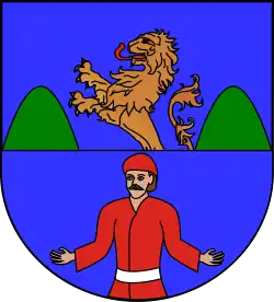 W polu błękitnym, dwudzielnym w pas, od czoła lew wyskakujący barwy naturalnej między zielonymi wzgórzami. Od podstawy mąż od pasa w szacie czerwonej i takiejż czapce. Klejnot: nieznany. Labry nieznane.