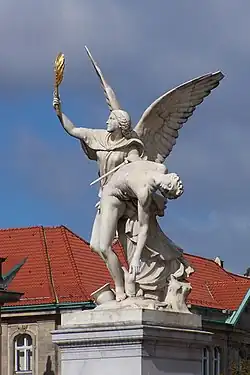 - ↑ W tłum. na j. pol. „Nike niesie poległego bohatera na Olimp”.